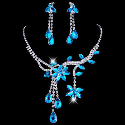 Add the Perfect touch of Shine & Elegance your Look with this Necklace & Earring Set, featuring Sparkling Aqua Blue floral Crystal Leaves & Teardrop Pendants!