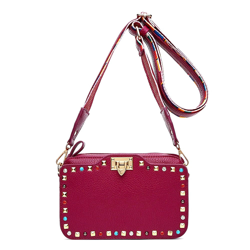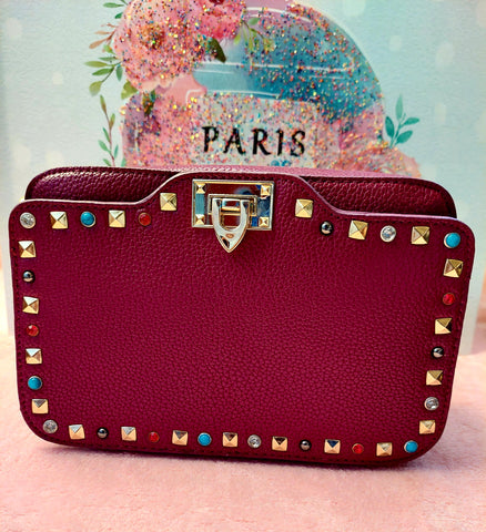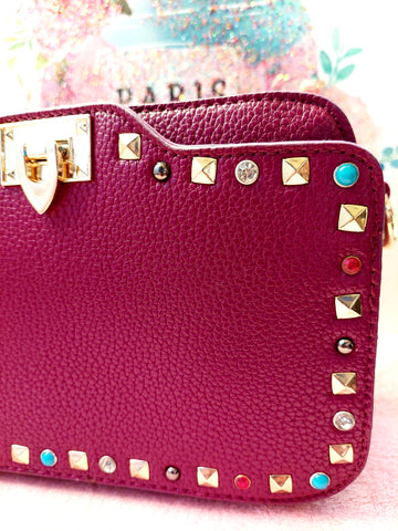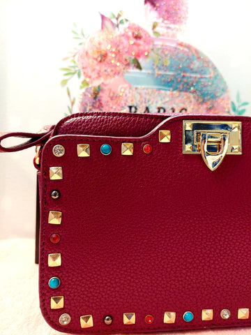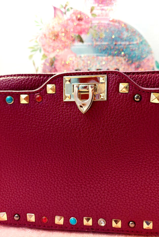 Wine "BeYoutiful Junie" Solid Flap Over Gemstones And Studs Messenger Bag Features: