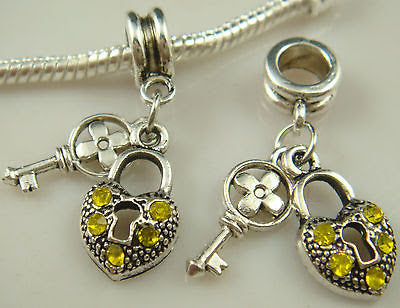 Yellow Crystal Embellished "BeYoutiful Key to My Heart" Silver Alloy Pendant Charm Bead