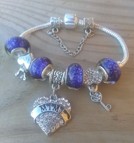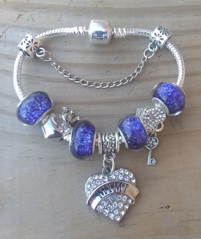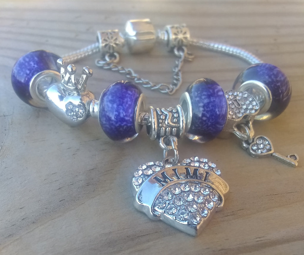 7.5" One-of-a-Kind Sparkling Crystal & Blue Glass "BeYoutiful Chic" Barrel Clasp Alloy Charm Bracelet Featuring Our "BeYoutiful Mimi" Crystal Heart Charm Bead