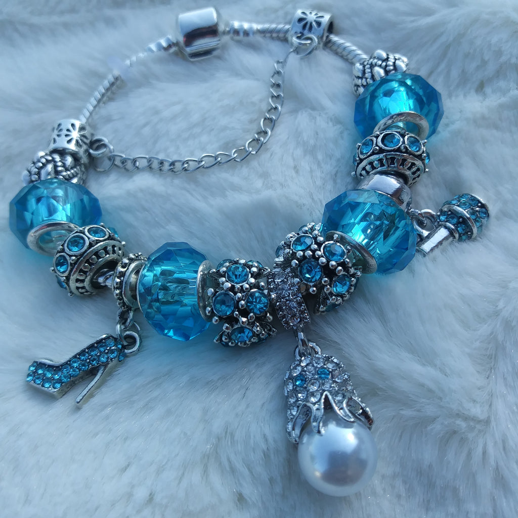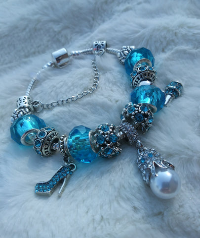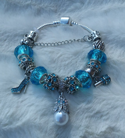 Sparkling Chic One-of-a-Kind 8" Silver Alloy Barrel Clasp "BeYoutiful Luxe" Aqua Crystal Pearl Charm Bracelet Featuring our 925 Sterling Silver Core "BeYoutiful Aqua" Glass Murano Beads