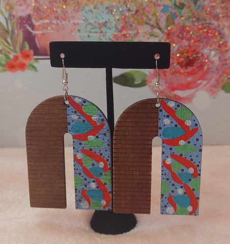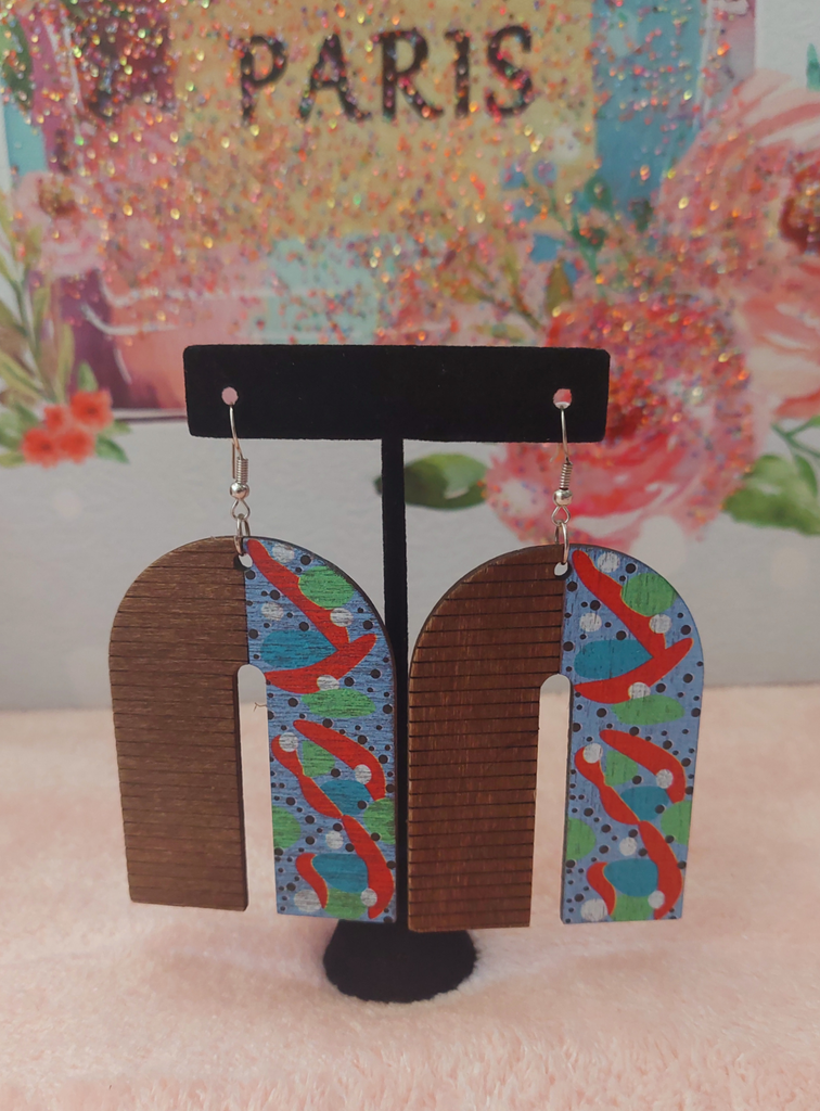 3" Blue Geometric "BeYoutiful Lyra" Painted Wood Arch Dangle Earrings