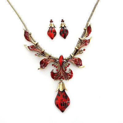 Elegant Gold Vintage Chic "BeYoutiful Phoenix" Red Crystal Embellished Drop Pendant Statement Necklace Set