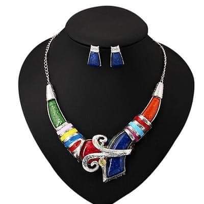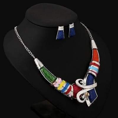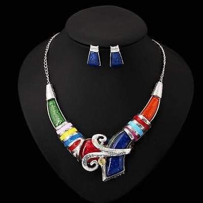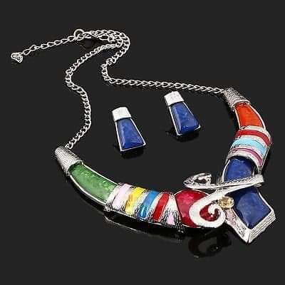 Bold & Vibrant Gorgeous Glamour "BeYoutiful Retro" Vintage Rainbow Silver Alloy Statement Necklace Set