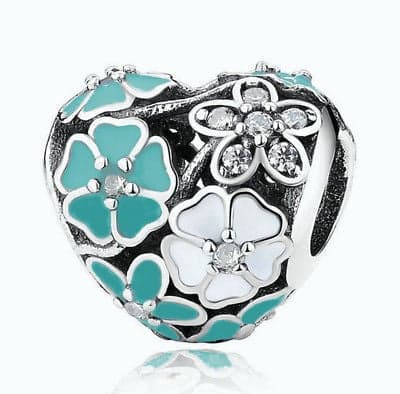 Unique Teal Floral Crystal "BeYoutiful Hearts of Bloom" Silver Alloy Charm Bead