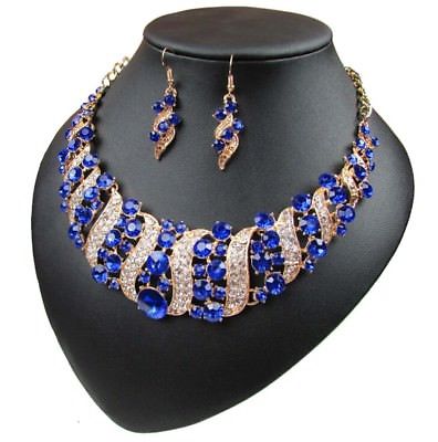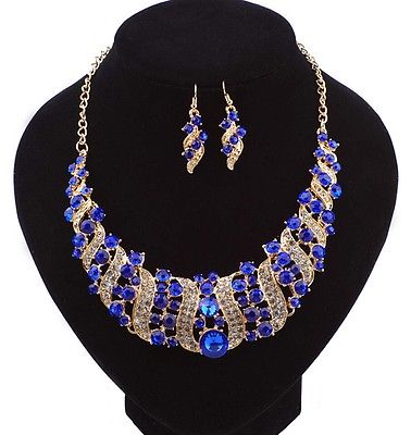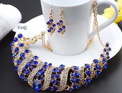 Bold & Elegant Sapphire Crystal Embellished "BeYoutiful Mystic" Chunky Gold Ribbon Alloy Statement Necklace Set