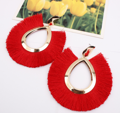 3" Sleek Gold Post Oval Alloy Bohemian Chic Candy Apple Red "BeYoutiful Gaia" Drop Fringe Dangle Statement Earrings